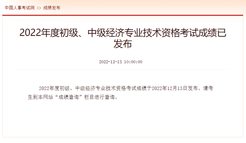 北京市2022年中級經(jīng)濟師成績公布了,根據(jù)2022年中國人事考試網(wǎng)中的信息,我們得知,2022中級經(jīng)濟師成績查詢時間是12月13日起,具體的官方信息截取如下:
