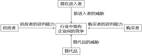 邁克爾·波特教授提出的“五力模型”分析法是分析行業(yè)結(jié)構(gòu)的重要工具。在一個(gè)行業(yè)里,普遍存在著五種基本競(jìng)爭(zhēng)力量,即潛在進(jìn)入者的威脅、行業(yè)中現(xiàn)有企業(yè)間的競(jìng)爭(zhēng)、替代品的威脅、購買者的談判能力和供應(yīng)者的談判能力,如下圖所示。這五種基本競(jìng)爭(zhēng)力量的狀況以及綜合強(qiáng)度,引發(fā)行業(yè)內(nèi)在結(jié)構(gòu)的變化,從而決定著行業(yè)內(nèi)部競(jìng)爭(zhēng)的激烈程度,決定了誰是行業(yè)中獲得利潤(rùn)最大化的最終贏家。