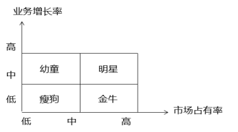 波士頓矩陣根據(jù)業(yè)務(wù)增長率和市場占有率兩項(xiàng)指標(biāo),將企業(yè)所有的戰(zhàn)略單位分為“明星”“金?!薄笆莨贰焙汀坝淄彼拇箢?,并以此分析企業(yè)的產(chǎn)品競爭力,為科學(xué)選擇企業(yè)戰(zhàn)略提供參考,如下圖所示。