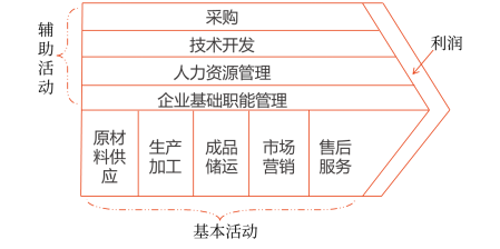 輔助活動:指用以支持基本活動而且內(nèi)部之間又相互支持的活動,包括采購、技術(shù)開發(fā)、人力資源管理和企業(yè)基礎(chǔ)職能管理。
