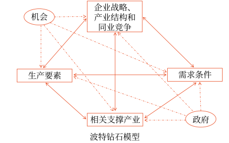 波特認(rèn)為,決定一個(gè)國(guó)家某種產(chǎn)業(yè)競(jìng)爭(zhēng)力的要素有四個(gè):生產(chǎn)要素、需求條件、相關(guān)支撐產(chǎn)業(yè)以及企業(yè)戰(zhàn)略、產(chǎn)業(yè)結(jié)構(gòu)和同業(yè)競(jìng)爭(zhēng)。這四個(gè)要素具有雙向作用,形成鉆石體系,稱為波特鉆石模型。