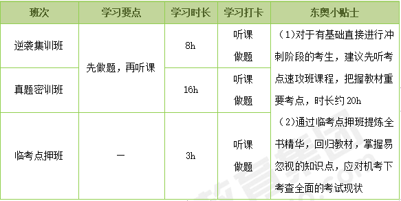 聽課任務(wù):逆襲集訓(xùn)班+真題密訓(xùn)班+臨考點押班等。