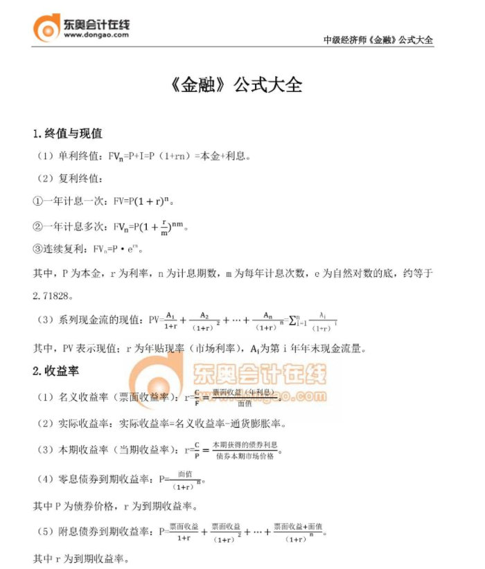 在2024年的中級(jí)經(jīng)濟(jì)師考試中,金融專業(yè)是一個(gè)重要的領(lǐng)域,它涵蓋了廣泛的金融理論和實(shí)際應(yīng)用。為了幫助考生更好地掌握金融知識(shí),以下是東奧會(huì)計(jì)在線老師們?yōu)橥瑢W(xué)們總結(jié)的關(guān)于《金融》公式大全,涵蓋了利率與金融資產(chǎn)定價(jià)、商業(yè)銀行經(jīng)營(yíng)與管理、投資銀行與證券投資基金、金融工程與金融風(fēng)險(xiǎn)等多個(gè)方面。