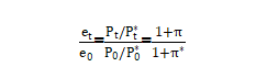 其中,e。表示基期匯率,et表示當(dāng)期匯率,π為本國通貨膨脹率,π*為外國通貨膨脹率。將公式兩邊都減去1,那么可以得到