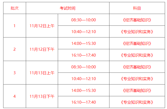 根據(jù)陜西、新疆等地近日發(fā)布的考務(wù)安排我們得知,2022年中級(jí)經(jīng)濟(jì)師考試安排預(yù)計(jì)分為四個(gè)批次,并且兩門考試科目之間有40分鐘間隔時(shí)間,具體時(shí)間安排請(qǐng)參考以下內(nèi)容: