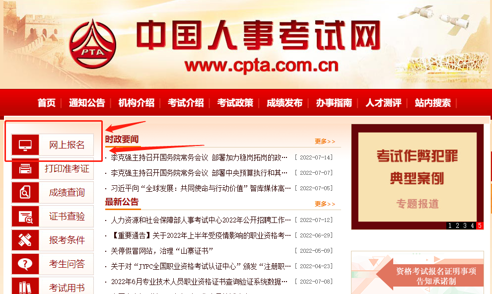 中級經(jīng)濟(jì)師考試從中國人事考試網(wǎng)報(bào)名,報(bào)名入口是全國統(tǒng)一的,進(jìn)入中國人事考試網(wǎng)官網(wǎng)(http://www.cpta.com.cn/)我們即可看到左側(cè)“網(wǎng)上報(bào)名”字樣,如圖: