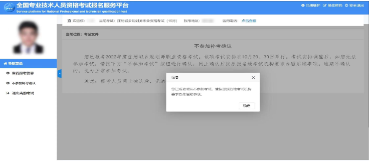 (五)再次登錄系統(tǒng),通過左側(cè)菜單進(jìn)入“不參加補(bǔ)考確認(rèn)” 欄目,核實(shí)確認(rèn)狀態(tài)。