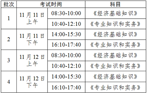 初中級經(jīng)濟考試分2天,上、下午共4個批次實施。各級別及專業(yè)類別的具體批次劃分和考試時間,視報名情況另行確定。