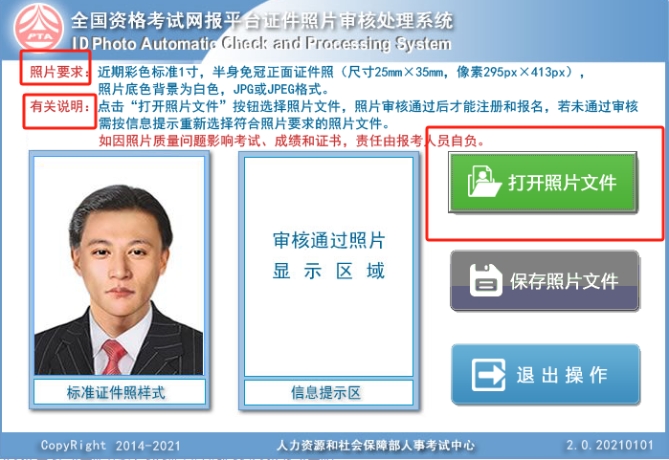 一、本工具是報名照片審核處理工具,只有審核通過的照片才能在注冊時正常上傳。照片將應(yīng)用在準(zhǔn)考證和合格證書中。