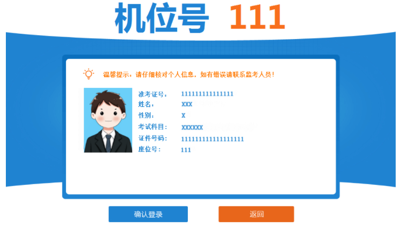 請應(yīng)試人員仔細核對本人信息,確認無誤后,點擊“確認登錄”按鈕,進入等待開考界面。