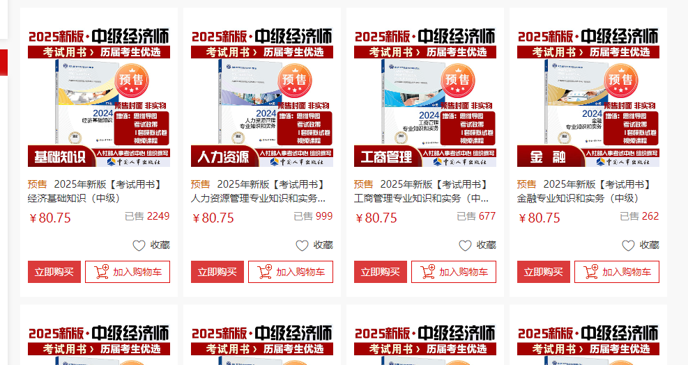 2025年中級(jí)經(jīng)濟(jì)師新版教材根據(jù)今年中國人事考試網(wǎng)的預(yù)售信息得知:每科為80元左右,考生需要考兩科,那么教材費(fèi)用需要花費(fèi)160元左右,具體截圖如下: