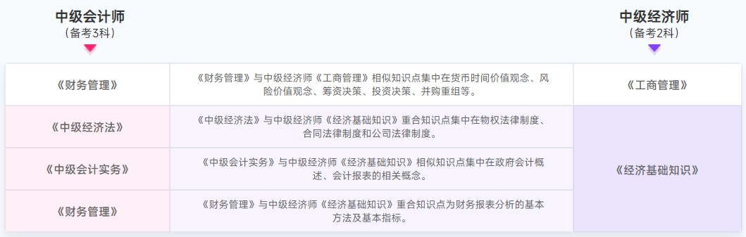 考試科目 | 《經(jīng)濟基礎(chǔ)知識》、《專業(yè)知識和實務(wù)》 | 《中級會計實務(wù)》、《財務(wù)管理》和《經(jīng)濟法》 |