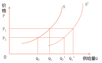 由于價格以外的其他因素如成本變動引起供給的相應(yīng)變動,這種變動表現(xiàn)為供給曲線的位移。(向左或向右)