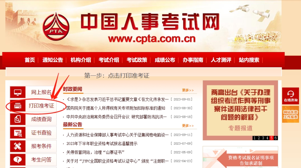 一、進(jìn)入中國(guó)人事考試網(wǎng)(http://www.cpta.com.cn/),點(diǎn)擊左側(cè)邊欄“打印準(zhǔn)考證”按鈕。