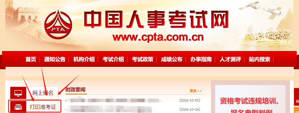打開中國人事考試網(wǎng)(http://www.cpta.com.cn/),點擊左側導航欄的“打印準考證”按鈕。