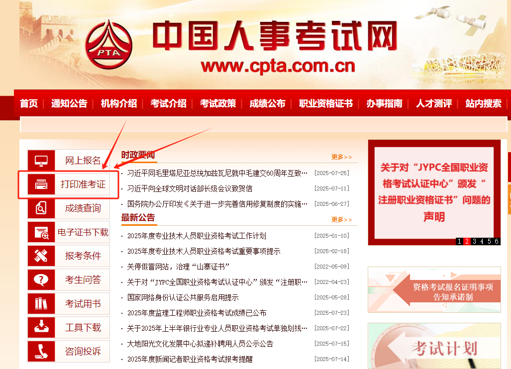 訪問中國人事考試網(wǎng)(http://www.cpta.com.cn),點擊首頁左側(cè)導(dǎo)航欄的“打印準考證”按鈕。