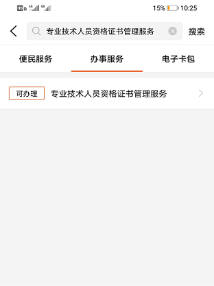 2.在搜索欄中搜索“專業(yè)技術(shù)人員資格證書管理服務(wù)”——“辦事服務(wù)”菜單下點擊“專業(yè)技術(shù)人員資格證書管理服務(wù)”
