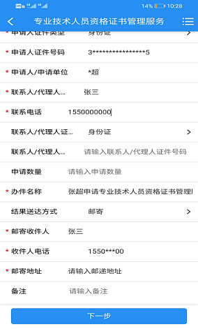 5.填寫收件人姓名、電話和郵寄地址后,點擊“下一步”(結(jié)果送達方式請選擇郵寄,備注中請注明領(lǐng)取何種專業(yè)技術(shù)資格證書。)