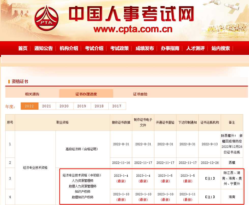 2022年中級(jí)經(jīng)濟(jì)師進(jìn)入領(lǐng)證的關(guān)鍵階段,已經(jīng)獲得電子證書的考生想必也在緊密關(guān)注著中國(guó)人事考試網(wǎng)的動(dòng)態(tài),近日,中國(guó)人事考試網(wǎng)已經(jīng)更新2022年度中級(jí)經(jīng)濟(jì)師的證書辦理進(jìn)度,除江西、湖南、海南、貴州、寧夏外,2023年1月5日起下達(dá)印制通知并開通證書查驗(yàn)入口,具體如下。