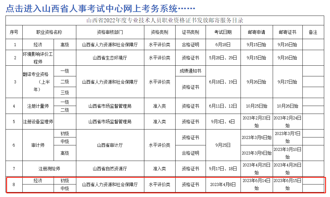 山西2022年中級(jí)經(jīng)濟(jì)師補(bǔ)考成績(jī)合格的考生們請(qǐng)注意,根據(jù)山西人力資源與社會(huì)保障局官方我們得知:“【郵寄目錄】山西省2022年度專業(yè)技術(shù)人員職業(yè)資格證書發(fā)放郵寄服務(wù)目錄”已經(jīng)更新,2022年中級(jí)經(jīng)濟(jì)師補(bǔ)考證書郵寄與6月15日起開始發(fā)放,具體列表如下。