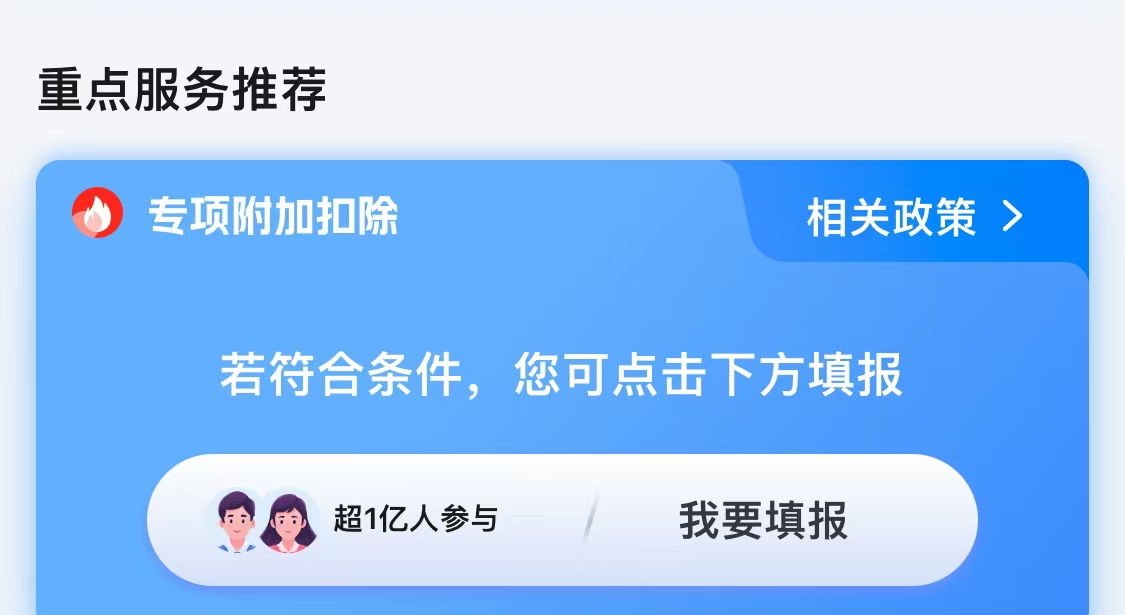 登錄APP后,在首頁找到 “專項(xiàng)附加扣除填報(bào)” 入口,點(diǎn)擊進(jìn)入。