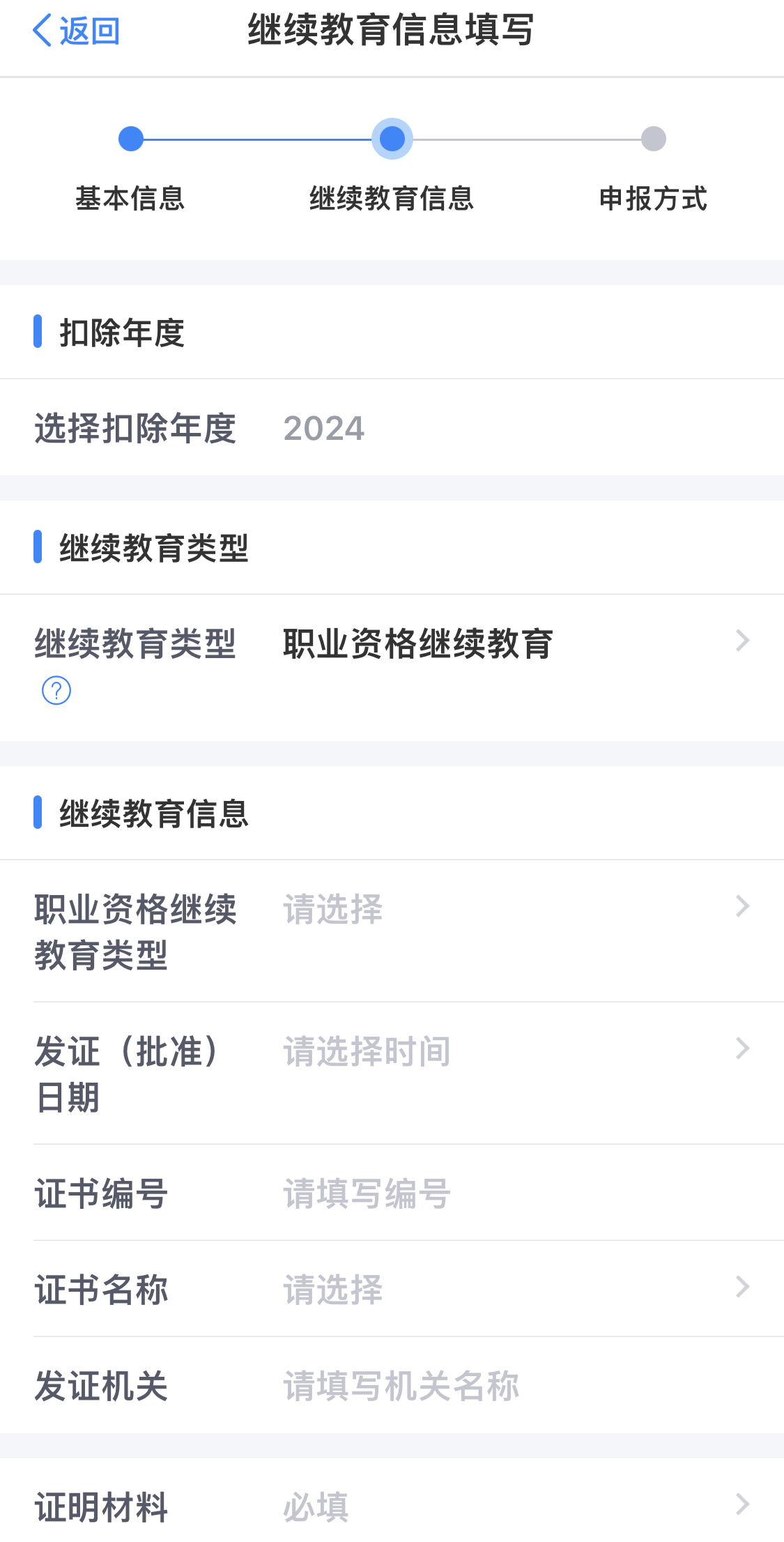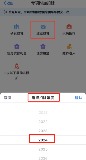 進(jìn)入專項(xiàng)附加扣除填報(bào)頁面后,從中選擇“繼續(xù)教育”選項(xiàng),隨后系統(tǒng)會彈出相關(guān)提示框,提示需要確認(rèn)一些基本的申報(bào)信息,比如扣除年度,此時(shí)應(yīng)選擇“2024”年,確認(rèn)無誤后點(diǎn)擊下一步,進(jìn)入繼續(xù)教育專項(xiàng)信息填寫的詳細(xì)頁面。