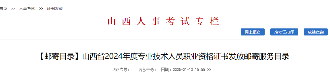 根據(jù)山西人事考試專欄發(fā)布“山西省2024年度專業(yè)技術(shù)人員職業(yè)資格證書發(fā)放郵寄服務(wù)目錄”消息我們得知:山西2024年中級(jí)經(jīng)濟(jì)師郵寄證書自1月13日起,請(qǐng)同學(xué)們進(jìn)入官網(wǎng)查看消息詳情,具體內(nèi)容如下。