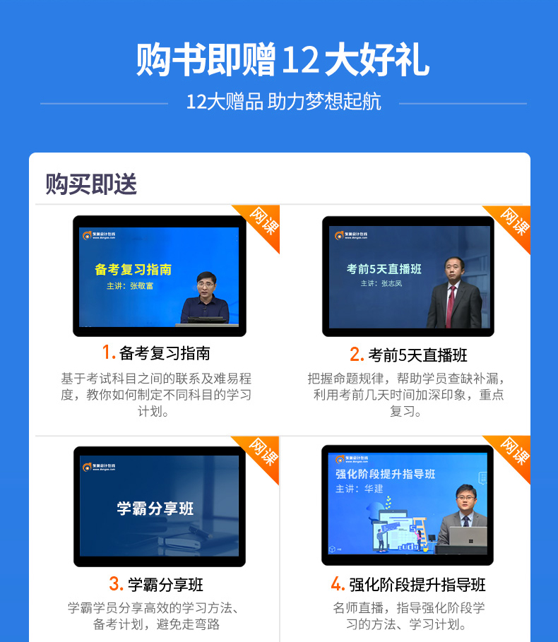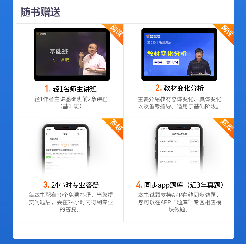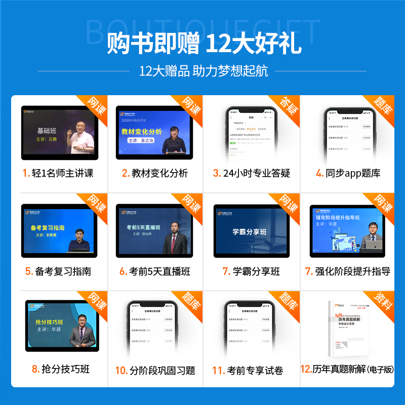 寶貝收到了。初級(jí)考試就用的東奧的輔導(dǎo),中級(jí)繼續(xù),書是正版不錯(cuò)~ 按網(wǎng)頁(yè)介紹的兩種領(lǐng)取贈(zèng)品方式都成功了 試聽了送的課件 中級(jí)學(xué)起來(lái)確實(shí)比初級(jí)要難點(diǎn) 排版跟初級(jí)差不多的模式 錯(cuò)過(guò)報(bào)名先買輕一看看 基礎(chǔ)最重要 書已到就要靜下來(lái)心來(lái)看書了 希望來(lái)年報(bào)名后一次三科全過(guò)~~