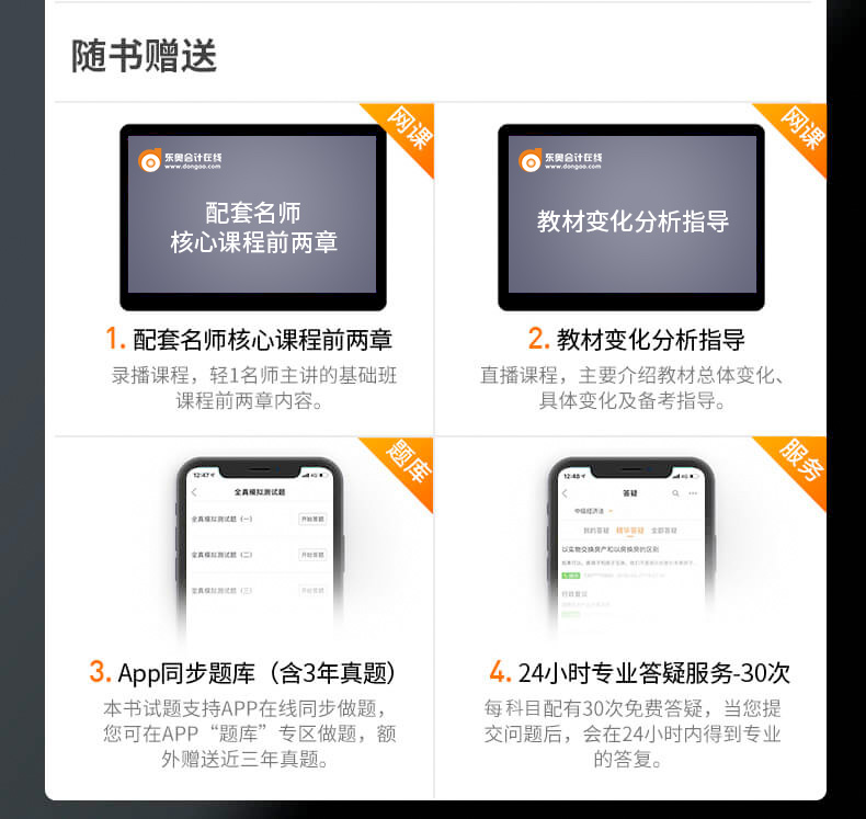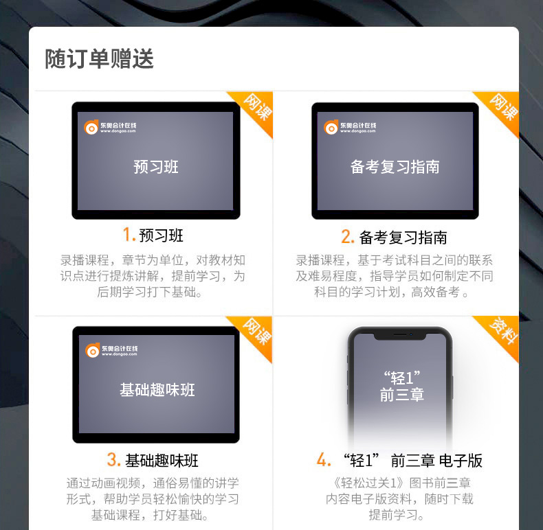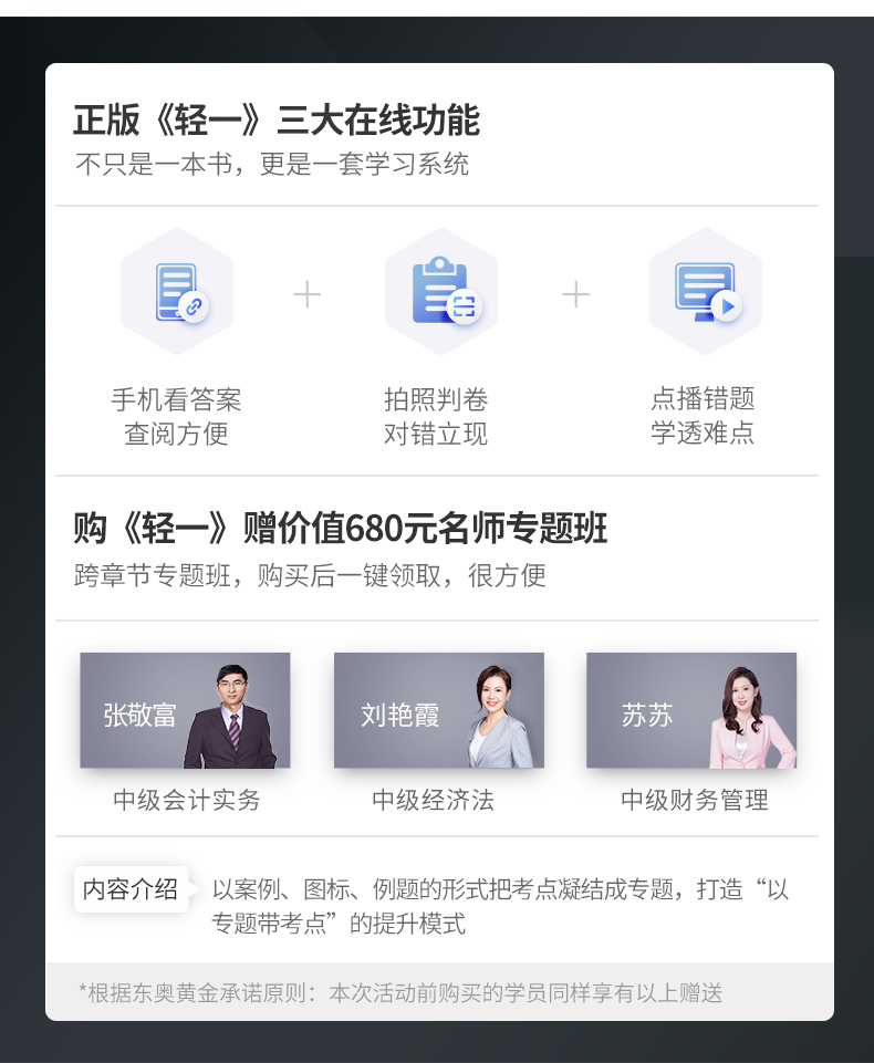寶貝收到了。初級考試就用的東奧的輔導(dǎo),中級繼續(xù),書是正版不錯(cuò)~ 按網(wǎng)頁介紹的兩種領(lǐng)取贈品方式都成功了 試聽了送的課件 中級學(xué)起來確實(shí)比初級要難點(diǎn) 排版跟初級差不多的模式 錯(cuò)過報(bào)名先買輕一看看 基礎(chǔ)最重要 書已到就要靜下來心來看書了 希望來年報(bào)名后一次三科全過~~