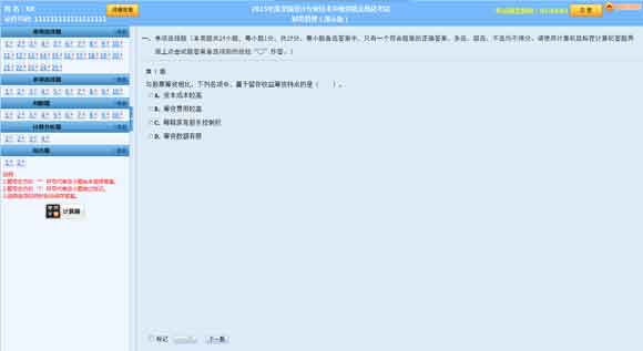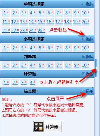 1. 根據(jù)考試科目不同,題目類(lèi)型分為單項(xiàng)選擇題、多項(xiàng)選擇題、判斷題、計(jì)算分析題、簡(jiǎn)答題和綜合題。題號(hào)右方的"*"號(hào)表示該小題還未作答,"?"號(hào)表示該小題做過(guò)標(biāo)記?忌梢酝ㄟ^(guò)題號(hào)列表查看本考試科目全套試卷的作答情況(包括每道試題的已答或未答狀態(tài)、標(biāo)記狀態(tài)),還可點(diǎn)擊各題號(hào)按鈕,直接進(jìn)入各試題進(jìn)行答題或檢查。