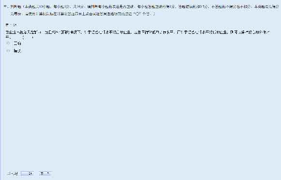 判斷題答題時(shí),考生直接用鼠標(biāo)點(diǎn)擊備選項(xiàng)中認(rèn)為正確的選項(xiàng)前的按鈕即可。如需修改答案,用鼠標(biāo)點(diǎn)擊其他備選項(xiàng)前的按鈕,原選擇的選項(xiàng)將被自動(dòng)替換。如需撤銷(xiāo)已經(jīng)選中的選項(xiàng),再次點(diǎn)擊該選項(xiàng)前的按鈕即可。
