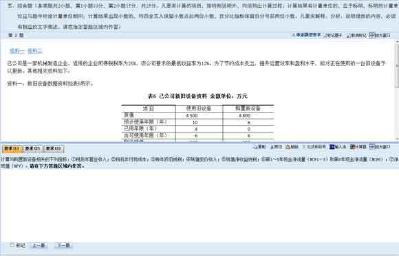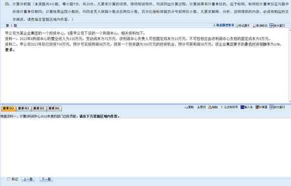 (1)計(jì)算分析題、簡(jiǎn)答題、綜合題都是上下分欄,上欄為資料(題干)區(qū),下欄為答題區(qū)。考生可根據(jù)需要上下拖動(dòng)分欄條,調(diào)整資料區(qū)或答題區(qū)的可視區(qū)域。答題區(qū)根據(jù)考試題目要求分為"要求(1)"、"要求(2)"、"要求(3)"等多項(xiàng)標(biāo)簽頁(yè)?忌凑找笤诟髯源痤}區(qū)域內(nèi)進(jìn)行答題。