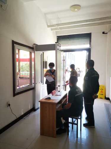 考生入場,利用體溫門進行體溫監(jiān)測。