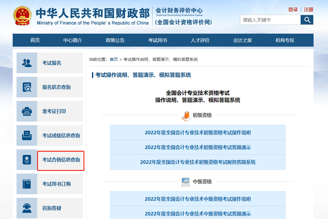 第一步:輸入網(wǎng)址,登錄“全國會計資格評價網(wǎng)”(http://kzp.mof.gov.cn/moni.jsp),點擊頁面左側(cè)【考試合格信息查詢】,進入查詢界面;