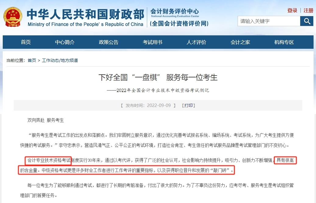 財(cái)政部在2022年發(fā)布的《下好全國“一盤棋” 服務(wù)每一位考生——2022年全國會(huì)計(jì)專業(yè)技術(shù)中級資格考試側(cè)記》文章中明確指出:會(huì)計(jì)專業(yè)技術(shù)資格具有很高的含金量,中級資格考試更是獲得職位晉升和發(fā)展的“敲門磚”!