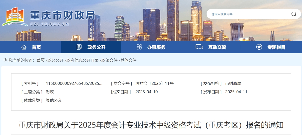 1. 4月11日前,重慶市財政局官網(wǎng) “重慶會計之家”欄目(http://czj.gov.cn/bsfw_268/)公布我市2025年度會計中級資格考試科目、考試時間、報名日期、報名方式等考試相關(guān)事項。