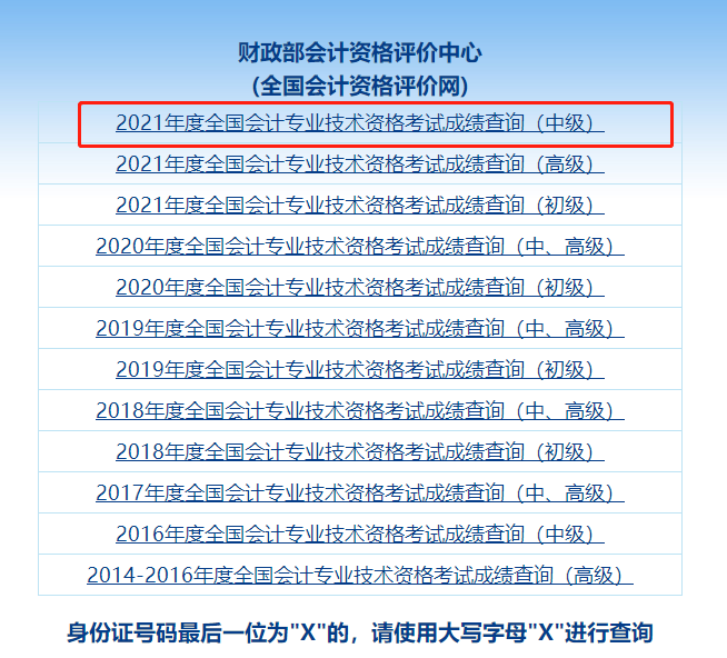 【Step2】點擊2021年度全國會計專業(yè)技術(shù)資格考試成績查詢(中級)