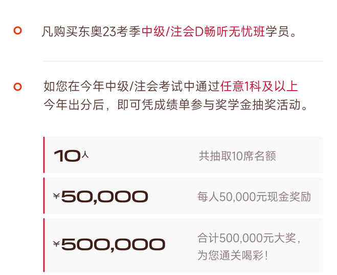 參加23年中級(jí)考試,并最終23年成績(jī)有1科及格通過。同時(shí)滿足以上兩個(gè)條件的東奧學(xué)員,即有資格參與50萬(wàn)現(xiàn)金均分活動(dòng)。