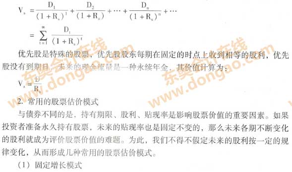 從理論上說,如果股東不中途轉(zhuǎn)讓股票,股票投資沒有到期日,投資于股票所得到的未來現(xiàn)金流量是各期的股利。假定某股票未來各期股利為Dt(t為期數(shù)),RS為估價(jià)所采用的貼現(xiàn)率即所期望的最低收益率,股票價(jià)值的估價(jià)模型為:
