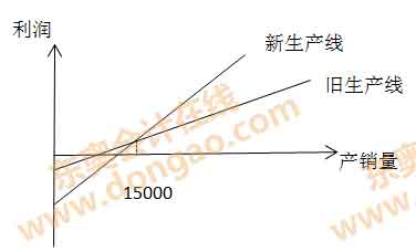 老師您好:我不明白為什么生產(chǎn)量低于15000件時,采用原來的生產(chǎn)線獲利多;當(dāng)高于銷量15000時采用新生產(chǎn)線。