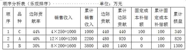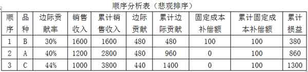 (4)按順序法,分別按邊際貢獻(xiàn)率的樂觀排列和悲觀排列,進(jìn)行多種產(chǎn)品的保本分析,計(jì)算各產(chǎn)品的保本銷售量及保本銷售額。
