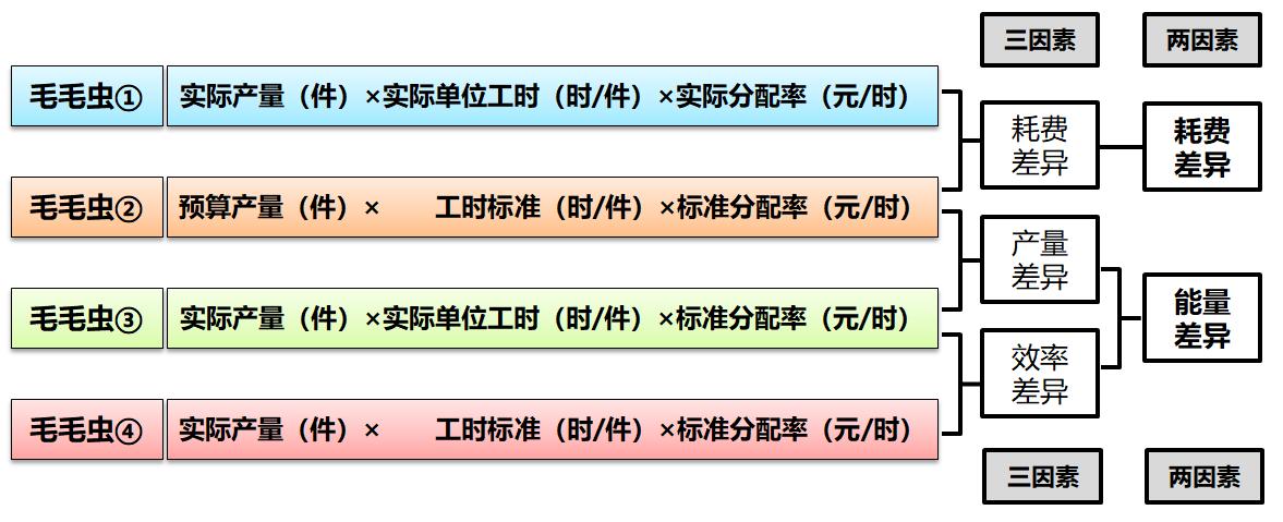 三差異法:①-②=耗費(fèi)差異 ②-③=產(chǎn)量差異 ?、?④=效率差異
