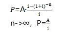 永續(xù)年金 | 普通年金的極限形式,當(dāng)普通年金的收付次數(shù)為無窮大時(shí)即為永續(xù)年金。已知普通年金A,求永續(xù)年金現(xiàn)值P。永續(xù)年金無終值 | |