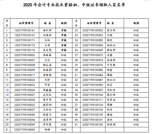 按照有關(guān)規(guī)定和要求,我區(qū)2020年度會(huì)計(jì)專業(yè)技術(shù)資格初、中級(jí)考試通過人員,領(lǐng)取證書通知: