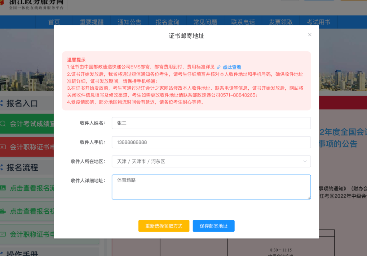 2.在證書開始發(fā)放前,請(qǐng)考生仔細(xì)填寫并核對(duì)本人收件地址和手機(jī)號(hào)碼,確保收件人信息詳細(xì)準(zhǔn)確,考生可在網(wǎng)上申請(qǐng)截止時(shí)間前,通過浙江會(huì)計(jì)之家網(wǎng)站修改本人收件地址、聯(lián)系電話等信息。證書開始發(fā)放后,網(wǎng)站將關(guān)閉收件人信息填寫及修改渠道,考生如需更改收件地址的,請(qǐng)聯(lián)系郵政速遞公司0571-88848265;