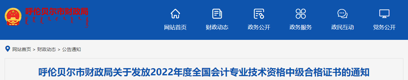 呼倫貝爾市財政局關于發(fā)放2022年度全國會計專業(yè)技術資格中級合格證書的通知