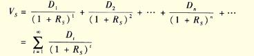如果股東不中途轉(zhuǎn)讓股票,投資于股票所得到的未來(lái)現(xiàn)金流量是各期的股利。假定某股票未來(lái)各期股利為D.(t為期數(shù)),尺s為估價(jià)所采用的貼現(xiàn)率即所期望的最低收益率,股票價(jià)值的估價(jià)模型為: