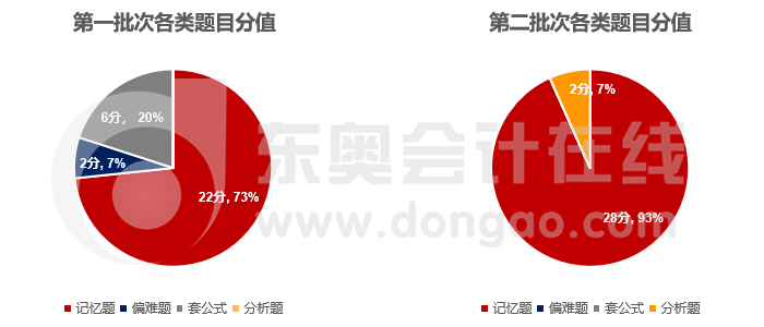 第一批次記憶題分?jǐn)?shù)占比為73%,偏難題分值占比7%,套公式題分值占比20%,分析題分值占比0%;