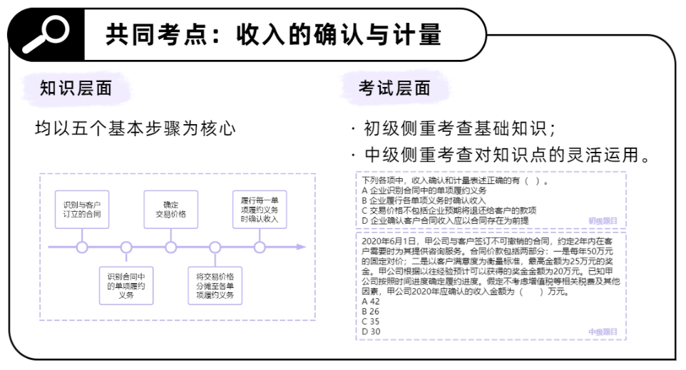 以初級(jí)會(huì)計(jì)職稱和中級(jí)會(huì)計(jì)職稱中《會(huì)計(jì)》科目中的共同知識(shí)點(diǎn)為例,可以發(fā)現(xiàn),對(duì)于知識(shí)點(diǎn)的考查范圍和深度是有顯著不同的,而也正是因?yàn)閷?duì)知識(shí)點(diǎn)的深入考查,中級(jí)會(huì)計(jì)考試的通過率基本上在20%左右,有相當(dāng)一部分考生對(duì)知識(shí)的掌握理解程度無(wú)法達(dá)到考試通過標(biāo)準(zhǔn)。
