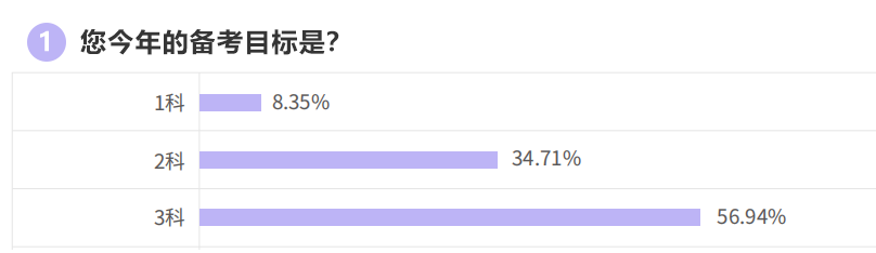 從問卷數(shù)據(jù)來看,有一半以上的考生(56.95%)的考生選擇一年同時(shí)備考三科,有34.71%的考生一年同時(shí)備考兩科,僅有不到10%的考生選擇一年過一科。